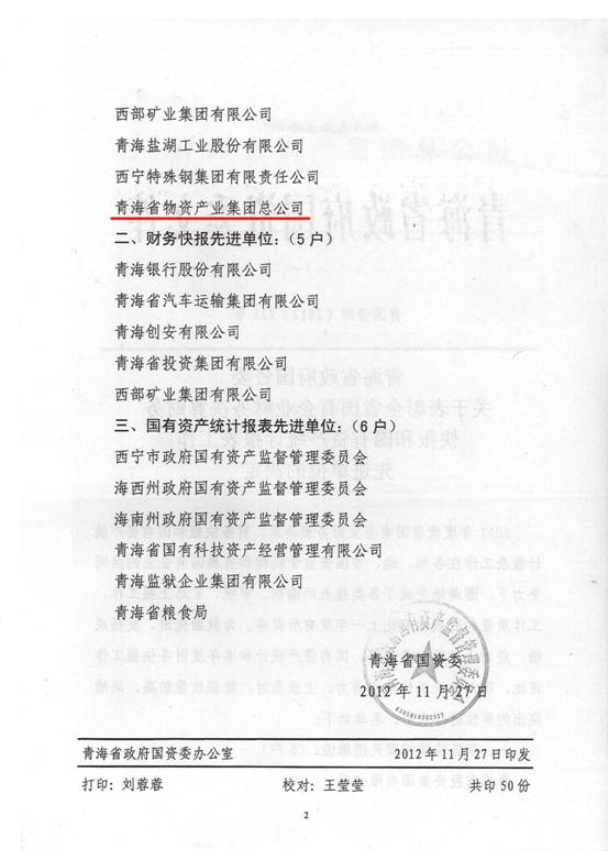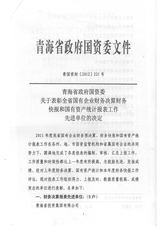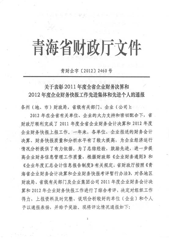 2012年,在集團(tuán)及所屬各公司領(lǐng)導(dǎo)的高度重視下,在所屬各公司的大力支持和密切配合下,在辛勤工作在財(cái)務(wù)會計(jì)崗位上的同事們的共同努力下,集團(tuán)總公司圓滿完成了省國資委和省財(cái)政廳各類報(bào)表的上報(bào)工作,財(cái)務(wù)信息工作質(zhì)量、時(shí)效性和財(cái)務(wù)分析水平都比上一年度有所提高,受到了省國資委和省財(cái)政廳的好評,集團(tuán)總公司2011年度財(cái)務(wù)決算工作被省國資委評為先進(jìn)單位,集團(tuán)財(cái)務(wù)審計(jì)部張莉青同志被省財(cái)政廳評為2012年度財(cái)務(wù)快報(bào)工作先進(jìn)個人。